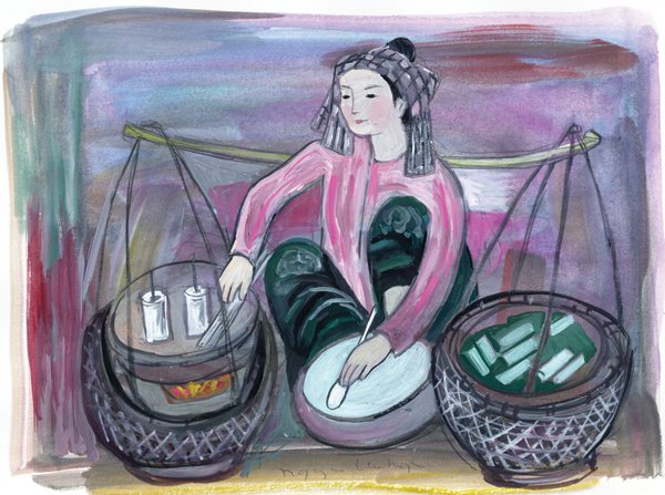 Hai ống kim loại này được gắn chặt vào một cái nồi gang lớn bằng một loại vật liệu ngăn hơi hình như là bằng xi măng hay đất sét nung gì đó, phía dưới có khoảng trống để đổ nước vào. Bà đốt lửa dưới bếp, bắt nồi khuôn bánh lên trên rồi đốt cho nước sôi bốc hơi lên hai ống sùng sục. Bà lấy hai cái que tre cắm dựng đứng vào giữa hai ống, rồi lấy thau bột nếp đã chế biến sẵn thành một loại bột vừa ươn ướt nhưng tơi xốp màu trắng đục ra, múc từng muỗng bột nếp đổ đầy vào hai ống. Lấy hai miếng gỗ mỏng tròn xuyên qua hai cái que đậy miệng ống lại. Vài phút sau, độ chừng bánh chín, bà giở nắp, cầm hai cái que rút nguyên cái bánh để lên cái mâm đồng đã cũ mòn có lót lá chuối xanh mượt. Bà nhanh nhẹn rút hai cái que ra, để lại trên mâm hai cái bánh có hình ống màu trắng hơi trong trong, nóng hổi và bốc mùi thơm phức. Sau đó, bà tiếp tục đổ bột vào khuôn hấp tiếp những cái bánh mới.