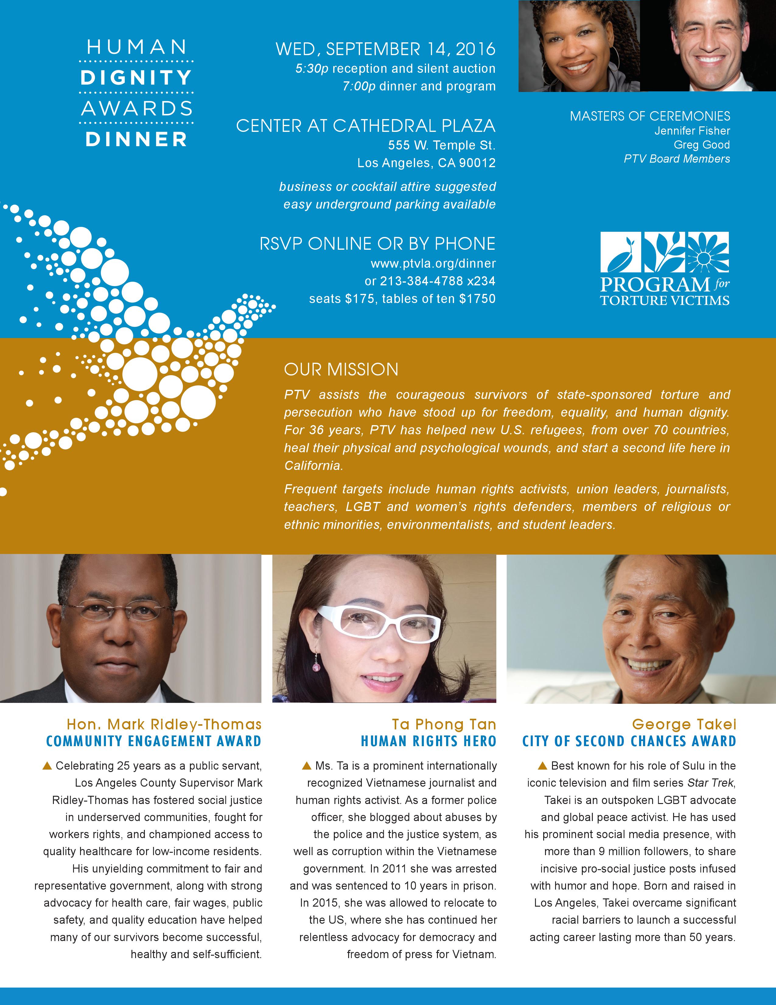 Chương Trình Program for Torture Victims (PTV) Human Dignity Awards ‘Phần thưởng về Nhân Phẩm’ tổ chức buổi ăn chiều Ngày thứ Tư 14 tây tháng 9 năm 2016. 7 giờ chiều, đúng PTV video giới thiệu của Ông Ted Nichelson Điều khiển chương trình: Greg và Jennifer. Phiên dịch viên: Trang Khanh.