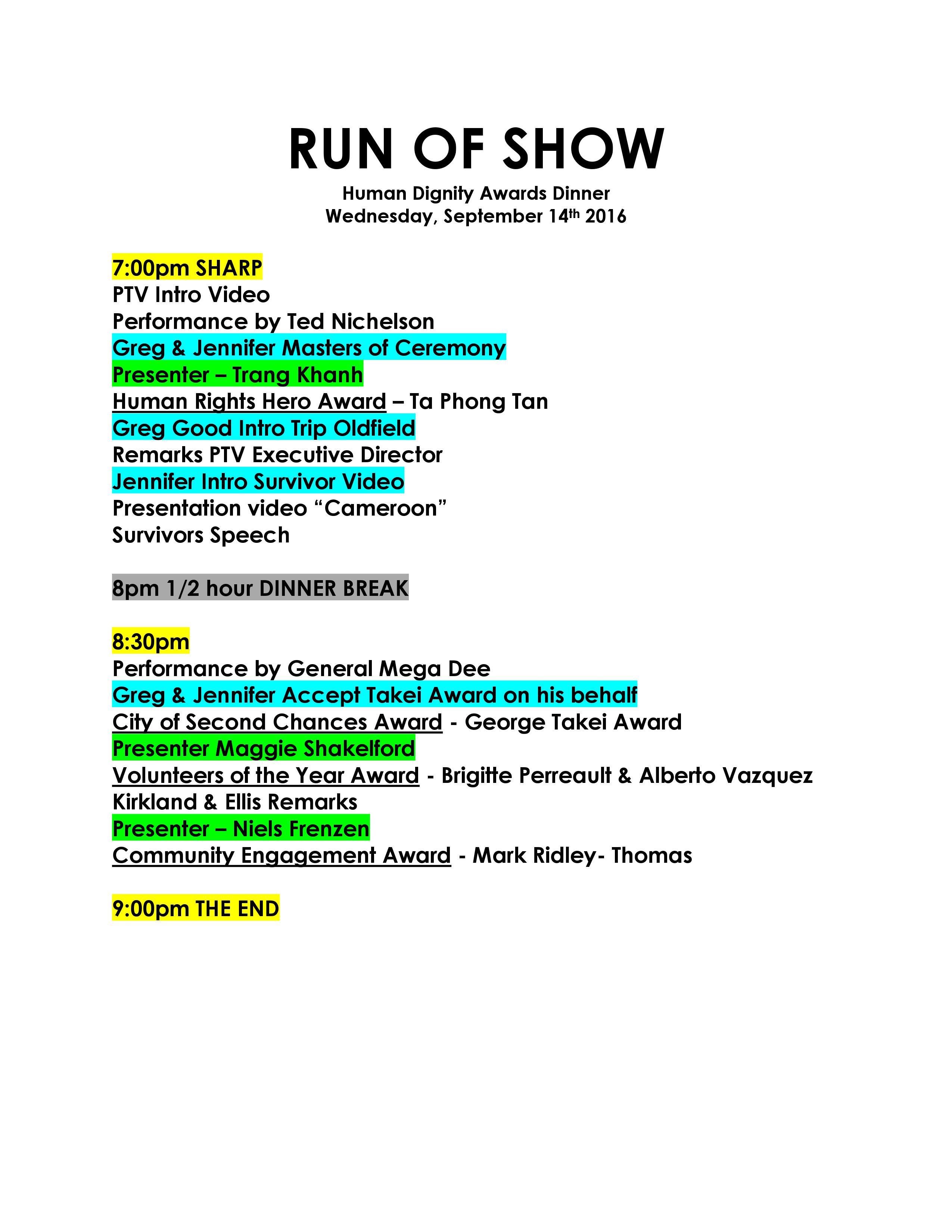 Chương Trình Program for Torture Victims (PTV) Human Dignity Awards ‘Phần thưởng về Nhân Phẩm’ tổ chức buổi ăn chiều Ngày thứ Tư 14 tây tháng 9 năm 2016. 7 giờ chiều, đúng PTV video giới thiệu của Ông Ted Nichelson Điều khiển chương trình: Greg và Jennifer. Phiên dịch viên: Trang Khanh.