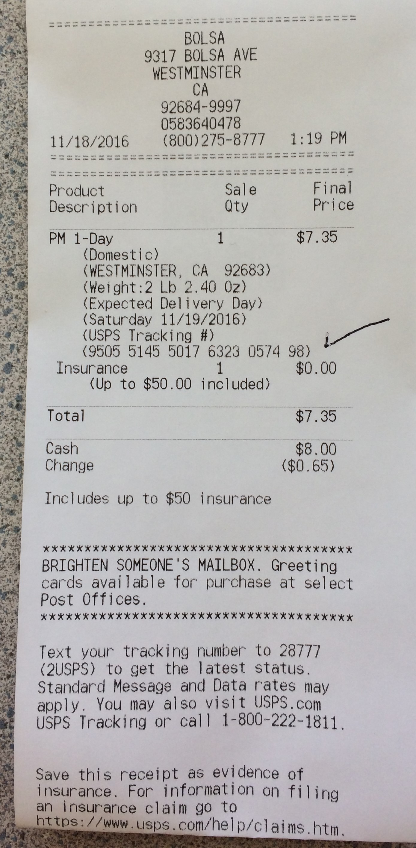Như đã thông báo, ngày 18 tháng 11 năm 2016 Tạ Phong Tần đã đến Bưu điện Westminster city gởi tấm biểu trưng giải NQVN năm 2012 mà Tạ Phong Tần đã nhận đến địa chỉ trụ sở MLNQVN tại Westminster city.
