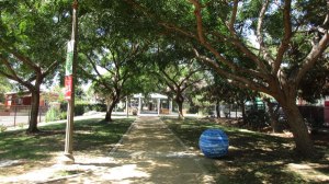 Công viên cũng nhỏ xíu, đi bộ từ đầu này đến đầu kia mất 10 phút là hết. Ưu điểm của nó là có những cây (không biết tên gì) thân thì không lớn (chứng tỏ chưa trồng lâu năm) nhưng tàn cây rất lớn, tỏa bóng mát rượi. Hai giờ chiều là thời điểm nóng nhất trong ngày, ở đâu cũng nóng, bước vô công viên này, dưới bóng cây gió mát rười rượi, chỉ muốn nằm xuống gốc cây mà ngủ.