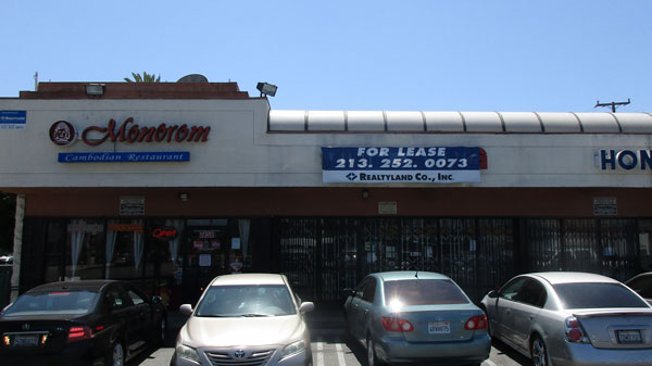 Nhà hàng Monorom (mà tôi cứ đọc lộn tên là Norodom, họ đức vua Kampuchea) trong khu thương xá E Anaheim Dawson, bài trí đặc trưng nét Kampuchea với các tranh vẽ, tượng Apsara, tượng Phật nhỏ bằng đồng, đá trắng, kim loại mạ bạc. Họ tiếp khách vui vẻ, niềm nở, giao tiếp với khách bằng tiếng Anh hoặc tiếng Khmer. Thực đơn cũng hai thứ tiếng như vậy. Không rành về món ăn Kampuchea nên chúng tôi kêu đại hai tô bò kho bánh mì, giá mỗi tô $7.5. Giá cả ở đây tương đương Little Sài Gòn, mỗi phần ăn không hơn $10. Phải công nhận bò kho bánh mì ở đây cách nấu cũng y chang người Việt, khác ở chỗ bánh mì hơi bở, và họ chỉ cho khách chanh tươi mà không có muối ớt (hoặc muối tiêu) ăn kèm.