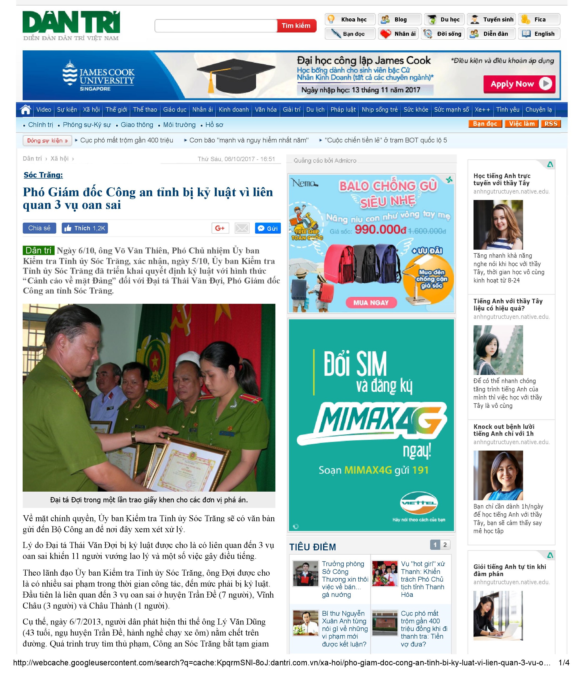Thái Văn Đợi, đại tá- phó giám đốc côn an tỉnh Sóc Trăng đã bỏ tù oan sai 11 người dân tỉnh Sóc Trăng và nhiều điều tai tiếng khác, vừa bị kỷ luật đảng với hình thức “cảnh cáo”.