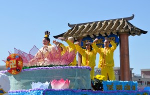 Đoàn diễn hành theo thứ tự số 64 là đoàn Pháp Luân Đại Pháp (còn gọi là Pháp Luân Công) của người Trung Hoa đại lục tỵ nạn Trung cộng. Với đồng phục đồng phục màu vàng sáng viền đỏ, may kiểu Trung Hoa cận đại, có thắt lưng màu vàng. Vài chục người đi bộ phía trước dẫn đầu, vừa đi vừa vẫy tay chào khán giả hai bên. Theo sau là chiếc xe lớn được trang trí cao phía trên là mái cung điện, xung quanh trang trí hình Thái cực đồ hai màu đen trắng, slogan “Chân- Thiện- Nhẫn”, khoảng chục người đứng trên xe biểu diễn các động tác nội công tâm pháp theo tiếng đàn, tiếng hát nhạc dân tộc phát ra trên xe.
