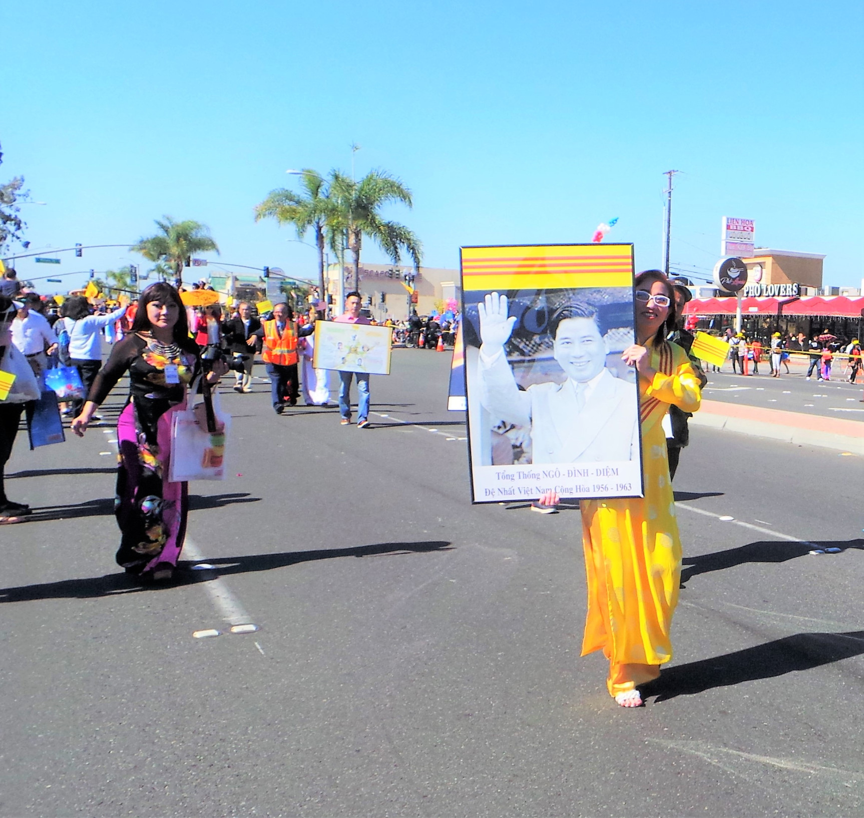Dẫn đầu là đoàn cung nghinh quốc tổ, đoàn rước đại kỳ VNCH, đại kỳ Hoa Kỳ cực lớn cần đến tám người mới căng được đại kỳ thẳng ra. Đoàn rước đại kỳ cao 2m rợp một màu vàng rực rỡ do các cô gái trẻ mặc áo dài trắng trịnh trọng hai tay nâng cao cán cờ, để cho lá đại kỳ vươn cao quá đầu người và bay phấp phới trong ánh nắng. Đoàn diễn binh các binh chủng cựu quân nhân VNCH, nhóm rước ảnh ba vị cố Tổng thống Ngô Đình Diệm, Nguyễn Văn Thiệu và Trần Văn Hương.