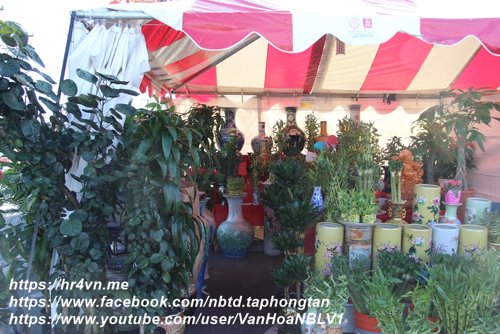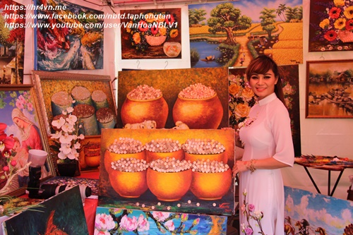Có một gian hàng mới nữa là gian bán tranh phong thủy may mắn của nữ họa sĩ xinh đẹp Thùy Vân. Chị Thùy Vân cho biết chất liệu vẽ tranh là sơn dầu nhưng không theo cách thông thường mà phết sơn dầu lên nền từng bệt dày lục cục, sần sùi như người ta trát xi măng lên tường, gắn thêm hột thủy tinh, những đồng xu “one cent” để tạo hình. Chủ đề của tranh là tình yêu, may mắn, sự thịnh vượng, phát triển… qua các biểu tượng truyền thống là cá chép (Lý Ngư Hóa Long), ngựa (Bát Tuấn Đồ), hoa mẫu đơn, hũ tiền vàng. Có một bức tranh chị Thùy Vân vừa hoàn thành, sơn dầu vẫn chưa khô, bức tranh mô tả một bình lúa trĩu hột chín vàng, ngồi cạnh bình lúa là hai chú chó con xinh xắn, dễ thương. Thần thái bức tranh toát lên vẻ sung túc, hiền hòa, bình an của làng quê lúa nước Việt Nam. Tuy nhiên, giá cả tranh không hề rẻ, thấp nhứt là $600/bức tranh, cao là $3,000 và hơn thế nữa, tùy kích cỡ và độ phức tạp của bức tranh. Bất ngờ hơn, chị Thùy Vân còn bán kèm áo dài Việt Nam đủ màu sắc có kết hoa hồng nổi (thắt bằng ruy băng) do chính tay “thợ may” Thùy Vân thực hiện.