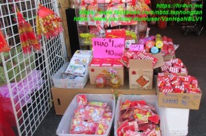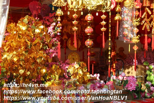 Người Việt có quan niệm: Màu đỏ rực, màu vàng tươi là hai màu đem lại may mắn, hạnh phúc, thịnh vượng nên không thể thiếu mặt các gian hàng bán dây treo trang trí và phong bao lì xì. Lủ khủ các loại dây treo lớn nhỏ dài ngắn, nhìn đến hoa cả mắt. Dây này để treo lúc lắc trên các cây kiếng, trong xe hơi, móc khóa… hình dạng mười hai con giáp, chiếc khánh, thiệp giấy màu đỏ thắm,… kết dây bông chỉ vàng lóng lánh, tôi đặt tên cho nó là gian hàng bán may mắn cho người mua. Phong bao lì xì lớn nhỏ đủ cỡ màu đỏ thắm in chữ vàng, in hình bông mai, hoa đào.