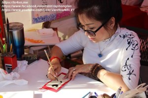 Tôi cũng gặp lại “chị đồ” Khánh Diệp xinh đẹp với gian hàng thư pháp chữ Việt. Tôi hỏi đùa chị Khánh Diệp có học thêm thư pháp chữ Hán chưa? Chị tươi cười trả lời khách hàng chỉ thích thư pháp hai mặt, một bên là tiếng Việt, một bên là tiếng Anh thôi, nên không cần học thêm chữ Hán. Năm nay là năm thứ hai Khánh Diệp có gian hàng thư pháp trong Hội Hoa Xuân, nên có lẽ khách hàng biết về Khánh Diệp nhiều hơn, gian hàng đắt khách hơn.