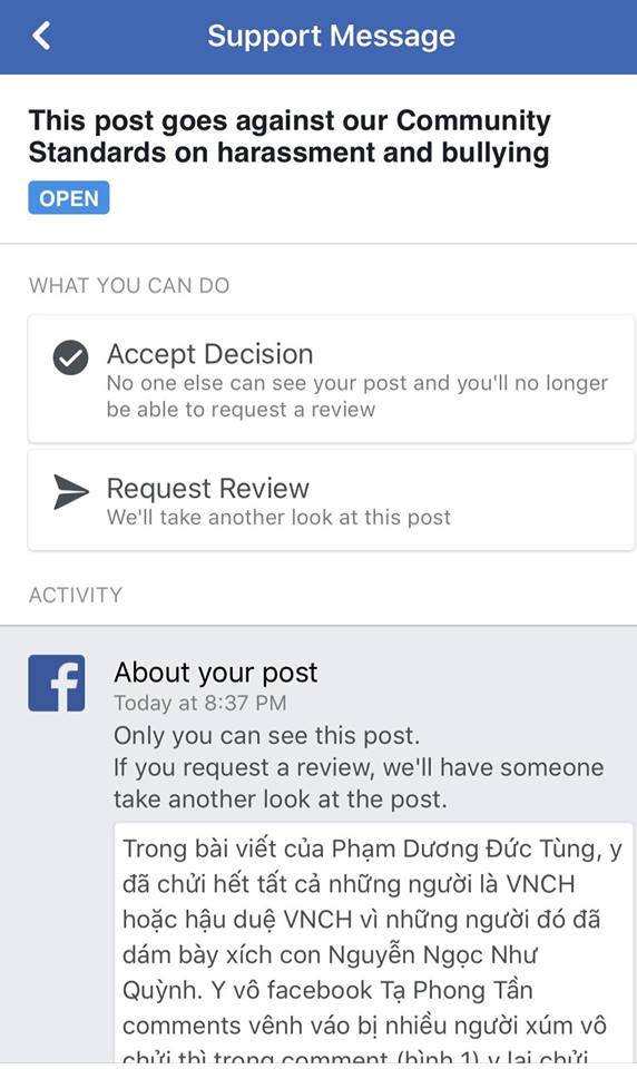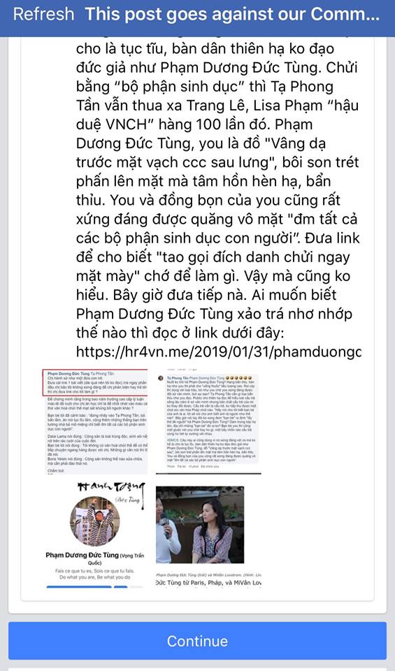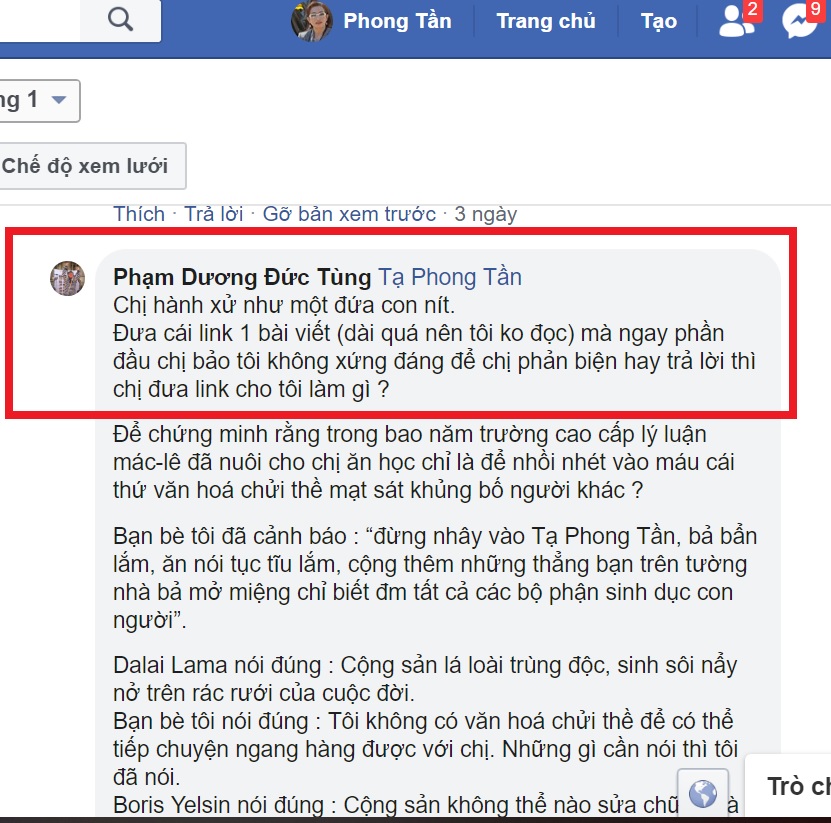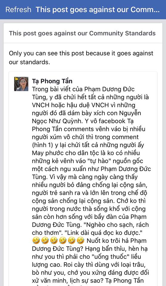 Nội dung dưới đây là bài viết của Tạ Phong Tần mà bầy đàn Phạm Dương Đức Tùng đã report Facebook rằng Tạ Phong Tần “bắt nạt và quấy rối” y.