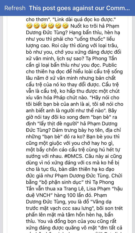 “Link dài quá đọc ko được.” (Hình 1) Nuốt ko trôi hả Phạm Dương Đức Tùng? Hạng bẩn thỉu, hèn hạ như you thì phải cho “uống thuốc” liều lượng cao. Roi cày thì dùng với loại trâu, bò như you, chớ you xứng đáng được đối xử văn minh, lịch sự sao? Tạ Phong Tần cần gì loại bẩn thỉu như you đọc. Public cho thiên hạ đọc để hiểu loài cẩu trệ sống lâu năm ở xứ văn minh nhưng bản chất cẩu trệ của nó ko thay đổi được. Cẩu trệ vẫn là cẩu trệ, ko hấp thu được một chút xíu văn hóa Pháp chút nào. “Hãy nói cho tôi biết bạn bè của anh là ai, tôi sẽ nói cho anh biết anh là người như thế nào”. Bây giờ nói tay đôi ko xong đem “bạn bè” ra định “lấy thịt đè người” hả Phạm Dương Đức Tùng? Dám trưng bày họ tên, địa chỉ những “bạn bè” đó ra không? Bạn bè you thì cũng một giuộc với you chớ hay ho gì, một bầy chồn cáo cẩu trệ cùng hú hét tự sướng với nhau.