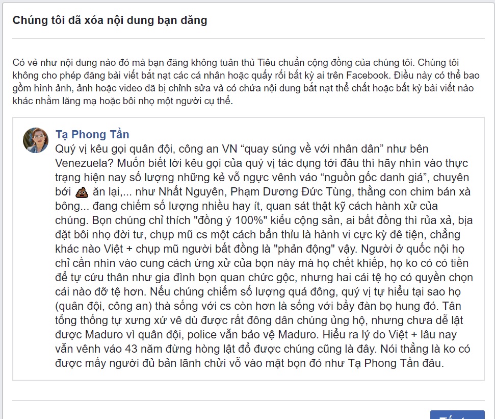 Quý vị kêu gọi quân đội, công an VN “quay súng về với nhân dân” như bên Venezuela? Muốn biết lời kêu gọi của quý vị tác dụng tới đâu thì hãy nhìn vào thực trạng hiện nay số lượng những kẻ vỗ ngực vênh váo “nguồn gốc danh giá”, chuyên bới cức ăn lại,… như Nhất Nguyên, Phạm Dương Đức Tùng, Trịnh Du, thằng con chim bán xà bông… đang chiếm số lượng nhiều hay ít, quan sát thật kỹ cách hành xử của chúng. Bọn chúng chỉ thích “đồng ý 100%” kiểu cộng sản, ai bất đồng thì rủa xả, bịa đặt bôi nhọ đời tư, chụp mũ “cộng sản” một cách bẩn thỉu là hành vi cực kỳ đê tiện, chẳng khác nào Việt cộng chụp mũ người bất đồng là “phản động” vậy. Người ở quốc nội họ chỉ cần nhìn vào cung cách ứng xử của bọn này mà họ chết khiếp, họ không có có tiền để tự cứu thân như gia đình bọn quan chức gộc, nhưng giữa hai cái tệ họ có quyền chọn cái nào đỡ tệ hơn. Nếu bọn bẩn thỉu như Nhất Nguyên, Phạm Dương Đức Tùng, thằng con chim bán xà bông… chiếm số lượng quá đông, quý vị tự hiểu tại sao họ (quân đội, công an) thà sống với cộng sản còn hơn là sống với bầy đàn bọ hung đó. Tân tổng thống tự xưng xứ Vê dù được rất đông dân chúng ủng hộ, nhưng chưa dễ lật được Maduro vì quân đội, police vẫn bảo vệ Maduro. Hiểu ra lý do Việt cộng lâu nay vẫn vênh váo 43 năm đừng hòng lật đổ được chúng cũng là đây.