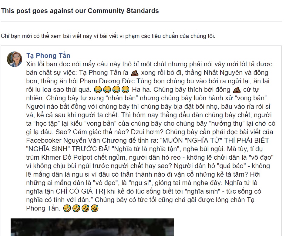 Xin lỗi bạn đọc nói mấy câu này thô bỉ một chút nhưng phải nói vậy mới lột tả được bản chất sự việc: Tạ Phong Tần ỉa đốn cứt xong rồi bỏ đi, thằng Nhất Nguyên và đồng bọn, thằng ăn hôi Phạm Dương Đức Tùng bọn chúng bu vào bới ra ngửi lại, ăn lại rồi lu loa sao thúi quá. 😂😂😂😂 Ha ha. Chúng bây thích bới đống cứt cứ tự nhiên. Chúng bây tự xưng “nhân bản” nhưng chúng bây luôn hành xử “vong bản”. Người nào bất đồng với chúng bây thì chúng bây bịa đặt bôi nhọ, bâu vào rỉa rói sỉ vả, kể cả sau khi người ta chết. Thì hôm nay thằng đầu đàn chúng bây chết, người ta “học tập” lại kiểu “vong bản” của chúng bây cho chúng bây “hưởng thụ” lại chớ có gì lạ đâu. Sao? Cảm giác thế nào? Dzui hơm? Chúng bây cần phải đọc bài viết của Facebooker Nguyễn Văn Chương để tỉnh ra: “MUỐN “NGHĨA TỬ” THÌ PHẢI BIẾT “NGHĨA SINH” TRƯỚC ĐÃ! “Nghĩa tử là nghĩa tận”, nghe bùi ngùi. Mà tùy, tỉ dụ trùm Khmer Đỏ Polpot chết ngủm, người dân hò reo – không lẽ chửi dân là “vô đạo” vì không chịu bùi ngùi trước người chết hay sao? Người dân hô “quả báo” – không lẽ mắng dân là ngu si vì đâu có thần thánh nào đi vặn cổ những kẻ tà tâm? Hỡi những ai mắng dân là “vô đạo”, là “ngu si”, giỏng tai mà nghe đây: Nghĩa tử là nghĩa tận CHỈ CÓ GIÁ TRỊ khi kẻ đó lúc sống biết tới “nghĩa sinh” – tức sống có nghĩa có tình với dân.” Chúng bây có tức tối cũng chả gãi được lông chân Tạ Phong Tần.
