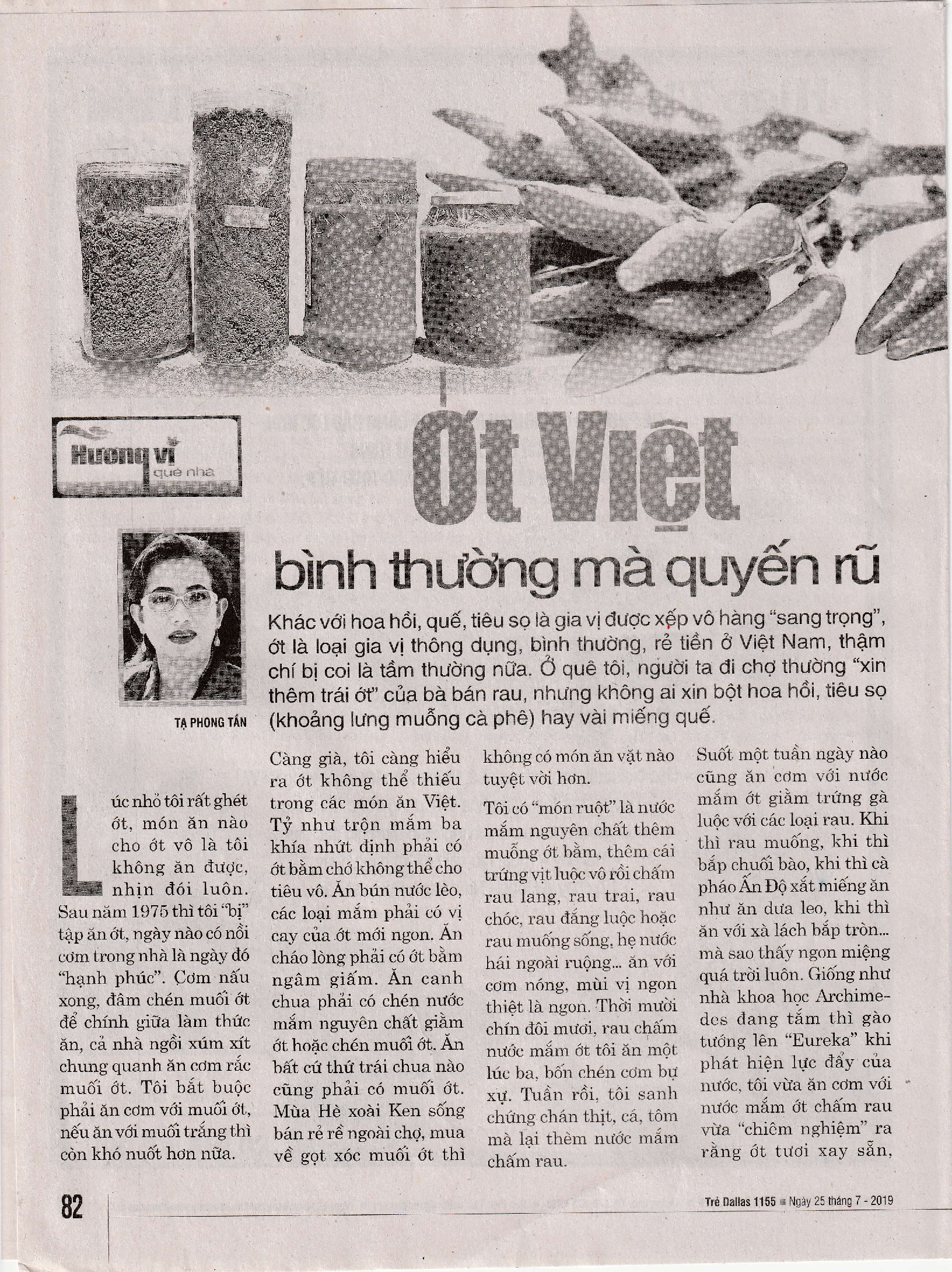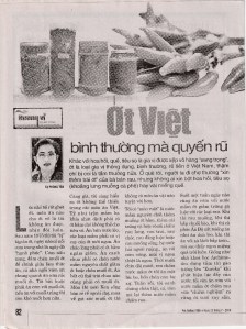 Khác với hoa hồi, quế, tiêu sọ là gia vị được xếp vô hàng “sang trọng”, ớt là loại gia vị thông dụng, bình thường, rẻ tiền ở Việt Nam, thậm chí bị coi là tầm thường nữa. Ở quê tôi, người ta đi chợ thường “xin thêm trái ớt” của bà bán rau, nhưng không ai xin bột hoa hồi, tiêu sọ (khoảng lưng muỗng cà phê) hay vài miếng quế.