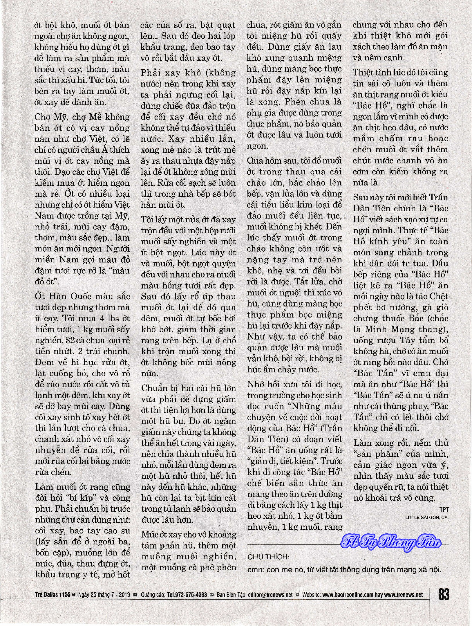 Nhớ hồi xưa tôi đi học, trong trường cho học sinh đọc cuốn “Những mẫu chuyện về cuộc đời hoạt động của Bác Hồ” (Trần Dân Tiên) có đoạn viết “Bác Hồ” ăn uống rất là “giản dị, tiết kiệm”. Trước khi đi công tác “Bác Hồ” chế biến sẳn thức ăn mang theo ăn trên đường đi bằng cách lấy 1 kg thịt heo xắt nhỏ, 1 kg ớt bằm nhuyễn, 1 kg muối, rang chung với nhau cho đến khi thiệt khô mới bỏ vô bịch nilon xách theo làm đồ ăn mặn và nêm canh. Thiệt tình lúc đó tôi cũng tin sái cổ luôn và thèm ăn thịt rang muối ớt kiểu “Bác Hồ”, nghĩ chắc là ngon lắm vì mình có được ăn thịt heo đâu, có nước mắm chấm rau hoặc chén muối ớt vắt thêm chút nước chanh vô ăn cơm còn kiếm không ra nữa là.