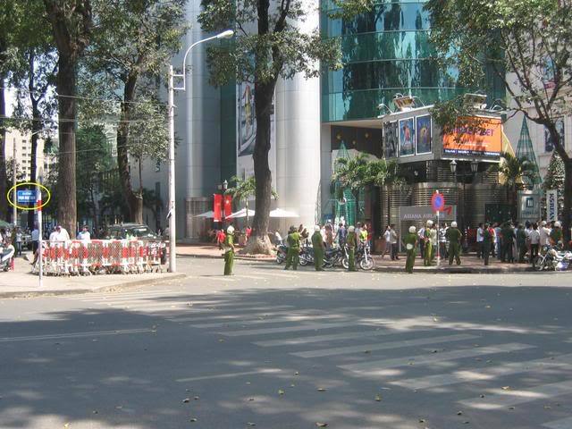 Ảnh chụp côn an TP HCM cản trở người biểu tình chống TQ năm 2007. “Điểm buộc” trong bức ảnh này là tấm biển tên đường NGUYỄN THỊ MINH KHAI (vòng tròn màu vàng). Tác giả: Tạ Phong Tần
