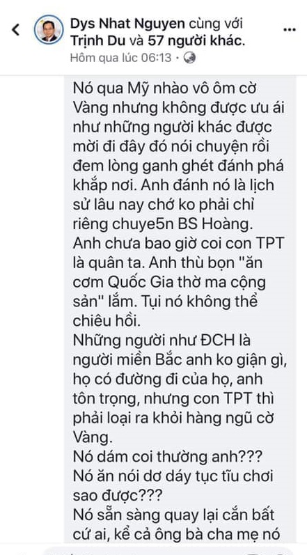 Nhứt Nguyên à, đáng lẽ tuổi mày thì tao phải gọi bằng anh, nhưng tư cách mày không xứng đáng nên buộc lòng tao phải gọi mày là thằng. Mày sống già mà không thông bài học ở đời là: “Kỷ sở bất dục, vật thi ư nhân”, mày tôn trọng người khác thì người khác tôn trọng lại mày, mày miệt thị người ta thì người ta cũng coi mày là cục 💩, chớ đâu ai ngu gì phải khép nép với mày.